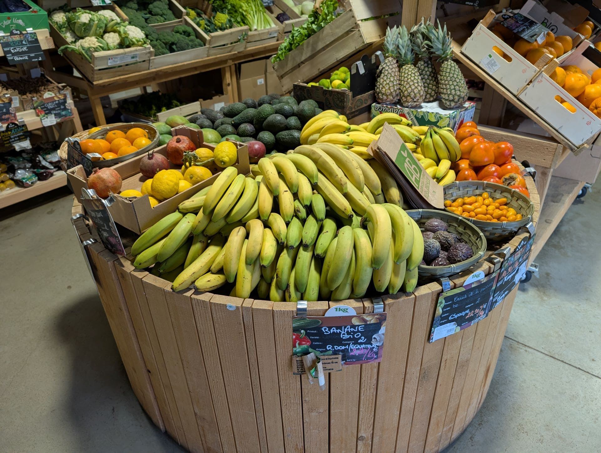 Produits bio et locaux. Fruits, légumes, vins, fromages, viandes, épicerie.