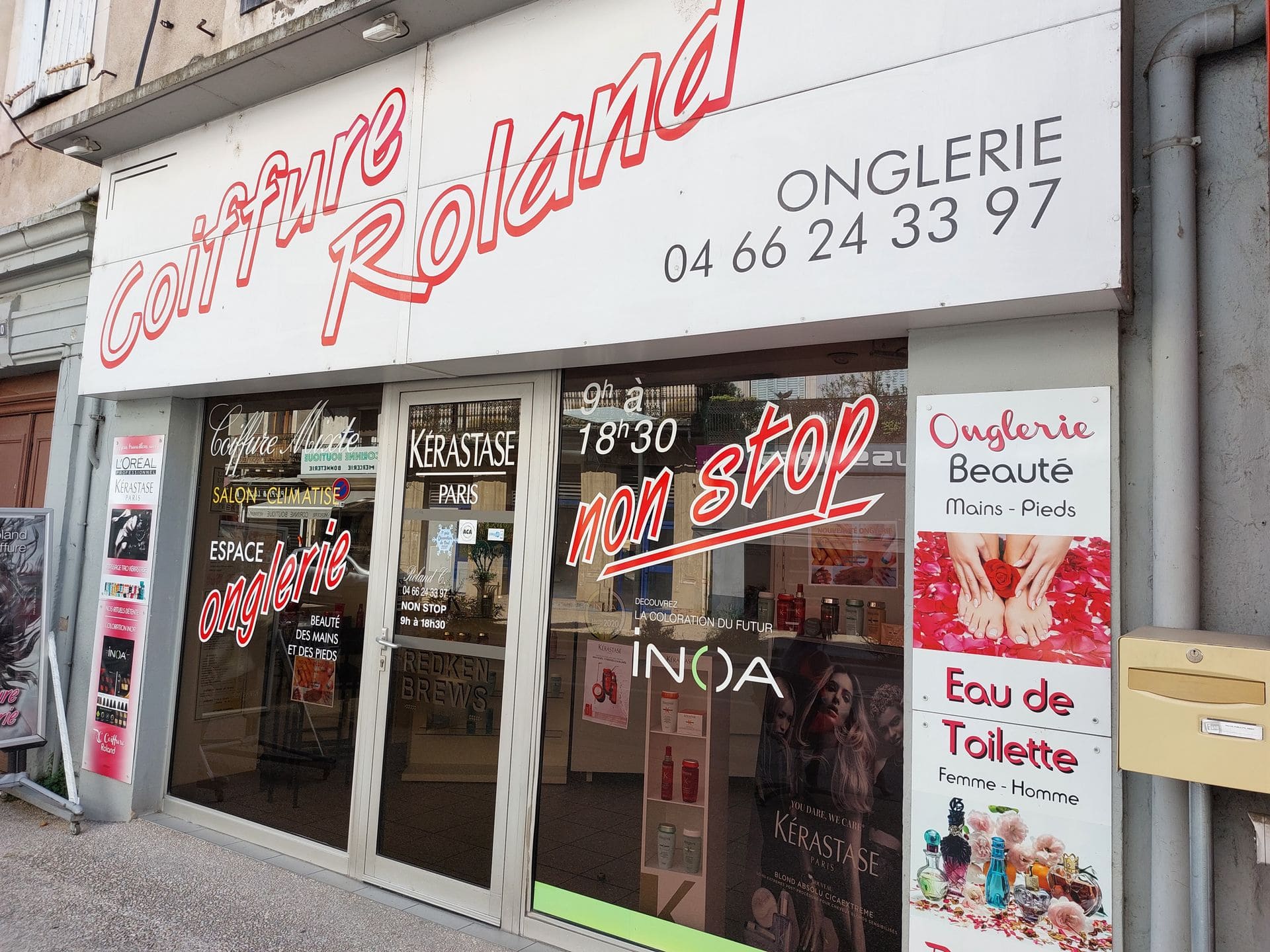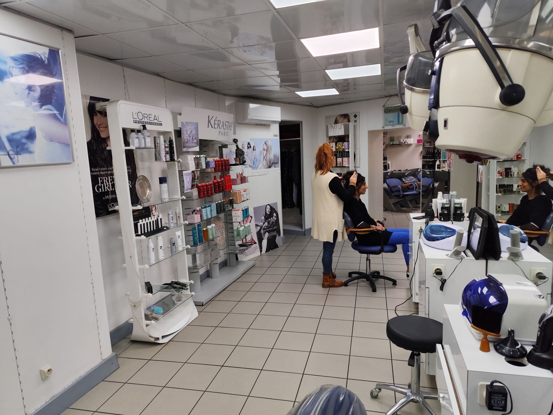 Coiffeur mixte. Exclusivité Kérastase. Vente de parfums. Massage tao crâniens, onglerie. L'Oréal coloration Inoa. Coupe aux ciseaux.